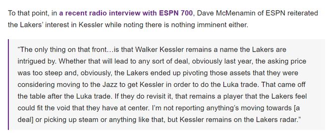 根据ESPN名记戴夫-麦克梅纳明的说法,湖人队依旧对沃克-凯斯勒感兴趣,他们此前用克内克特+1个未来首轮签来报价过,但爵士想要两个首轮签,今夏爵士可能会适当的降低一些要价,凯斯勒的年龄很适合这支湖人队。