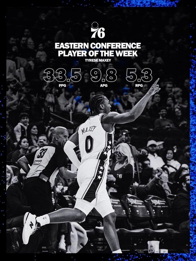 赛季至今,马克西场均33.7分4.8篮板9助攻,投篮命中率46.3%,三分命中率46.4%,罚球命中率87.7%。76人5胜1负,排名东部第一。